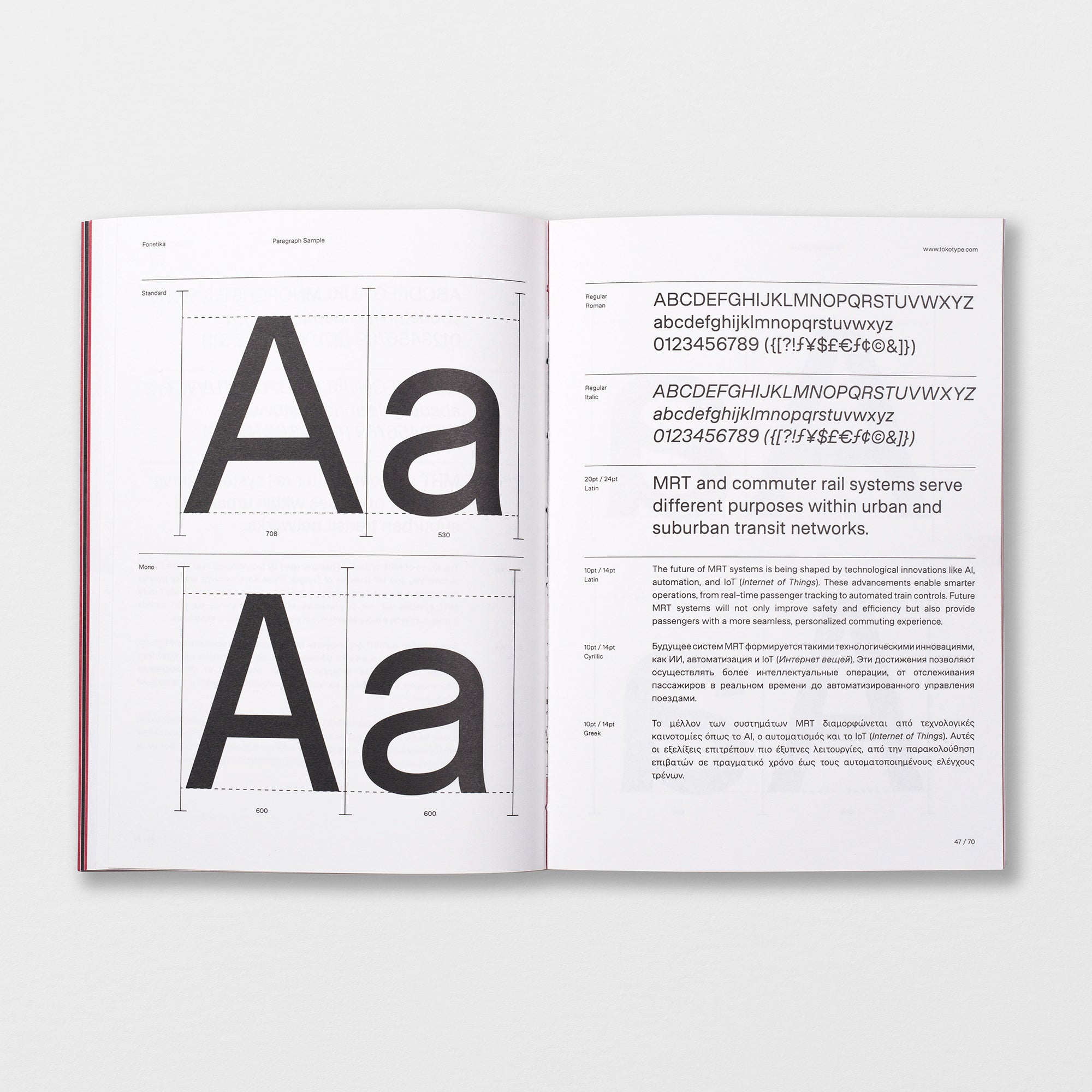 Everything you need to know about Fonetika in one beautifully printed package. This specimen showcases both Fonetika and Fonetika Mono families across 32 styles. Offset printed in two colors with perfect binding that lets the pages lay flat while you study the details. Perfect for your design library or as a gift for the type obsessive in your life.