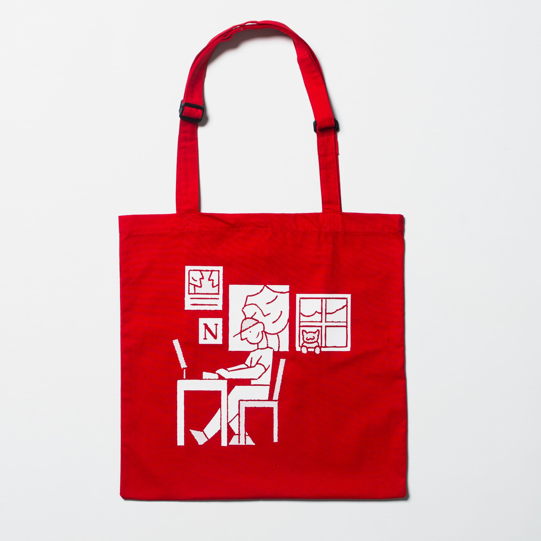 This bold red tote features our workspace illustration, a love letter to designers, typographers, and everyone who works with their hands and heart.