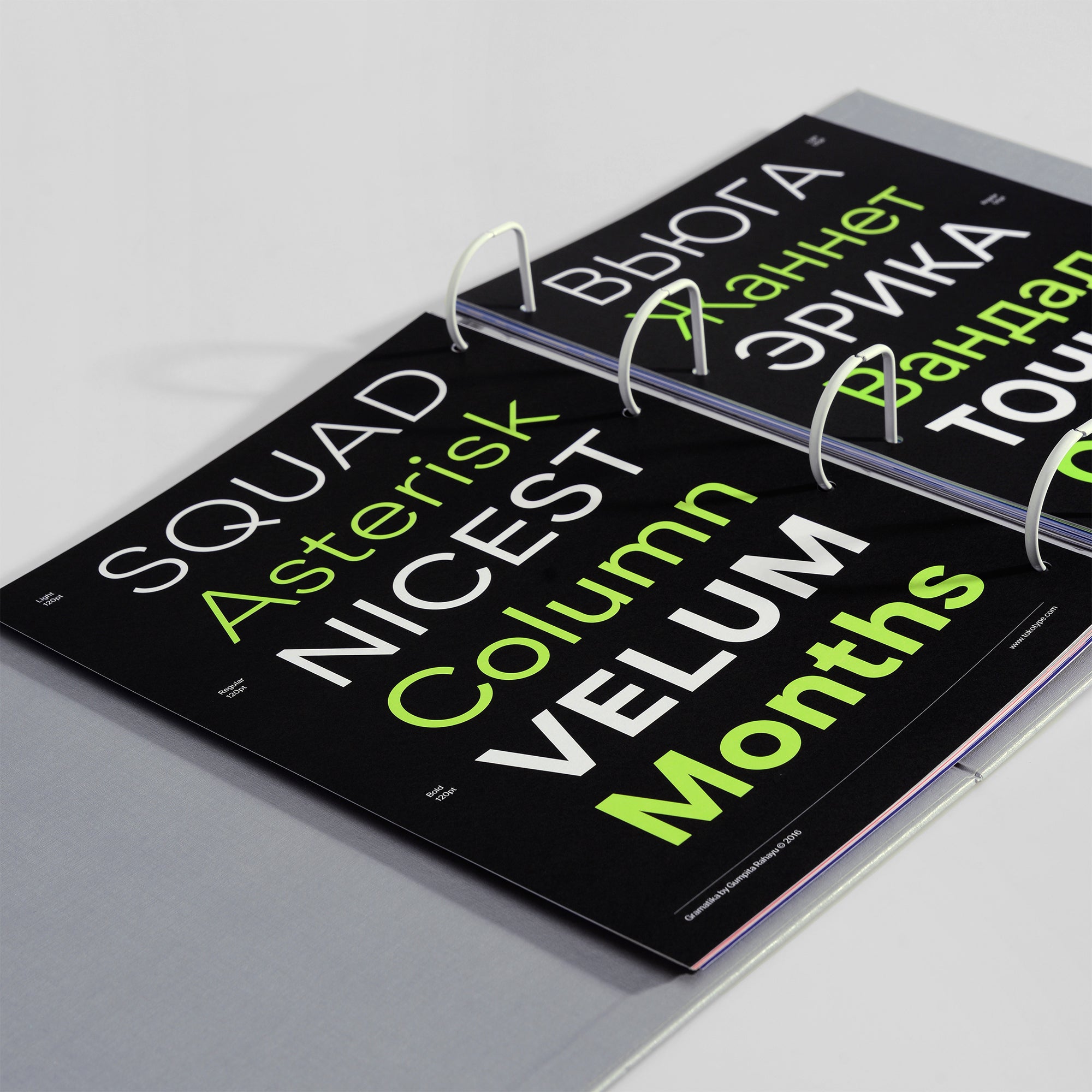 The set of Gramatika Type Specimen Sheets features high-quality prints on A4 paper; the sheets feature four-hole punch edges, allowing you to easily add them to our Type Specimen Archives Binder. Each sheet is printed with unique, intricate typefaces in a variety of sizes and styles, allowing you to explore the features and weights and showcasing the perfect example for your project.